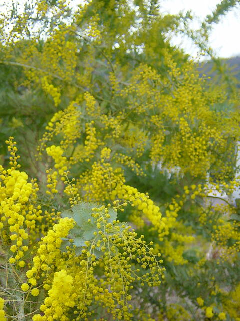 ミモザの花が見頃となった。受験生の目を楽しませてくれるかも。 |