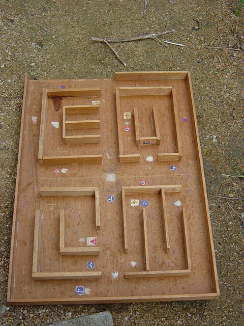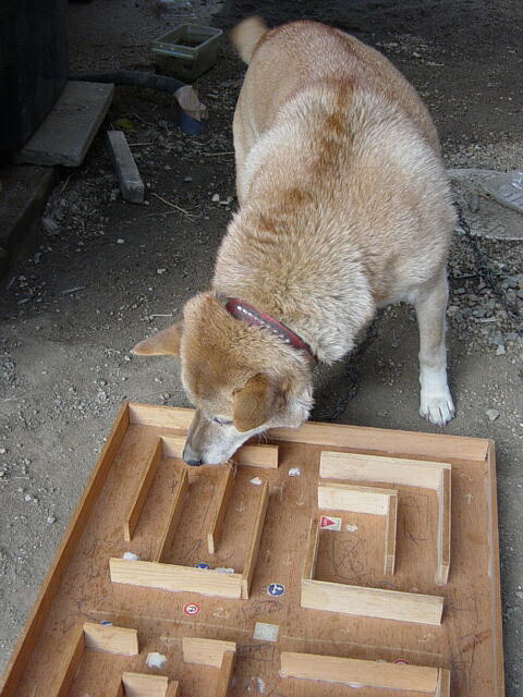 息子の引っ越しを想定して、おもちゃ類の整理をしている。写真左は、私の手作りの「教習所」。市販のミニカーを入れて遊ばせていた。写真右はわんこにプレゼントしたところ。