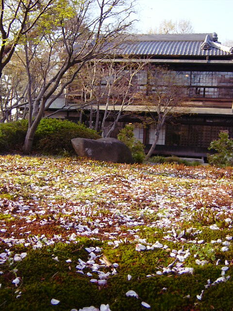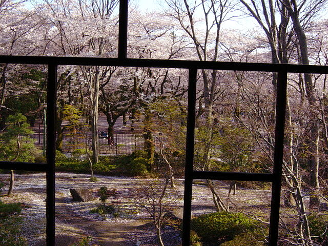 昨日に続き、江戸東京たてもの園内の写真(4/2撮影)。高橋是清邸の2階からは、小金井公園の桜を楽しむことができた。写真右は是清邸庭園から逆に建物方向を眺めたところ。4/2の時点ですでに散り始めていた。なお、この庭園は港区赤坂にあった高橋是清邸庭園の一部を復元したものであり、組井筒を水源にした流れと、雪見型灯籠などを含む景観を再現、是清は芝生での日光浴や庭の散歩を好んだといわれている。