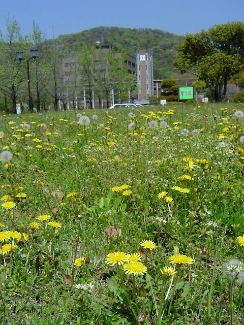 大学構内の至る所でタンポポの花が咲いている。いちめんに広がるお花畑はなかなか見事。 |