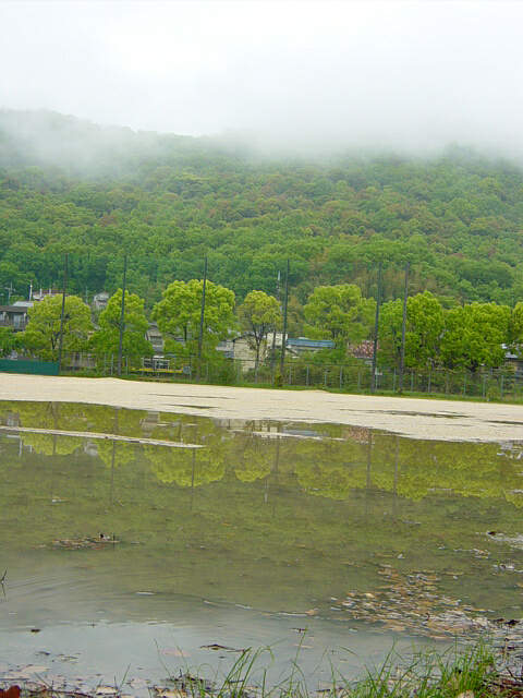 4月26日夜から27日朝にかけて岡山でもかなりの雨が降った。文法経グランドには大きな水たまりができ、半田山の新緑を映していた。 |
