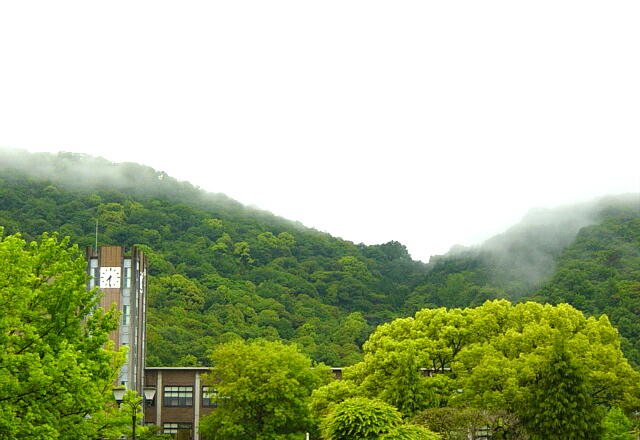 5月10日朝の時計台。緑が最も美しい時期である。全国の大学にはさまざまな時計台があるが、背景の素晴らしさという点では岡大が随一ではないかと思う。しかも、背景となっている半田山は、借景ではなくて、れっきとした岡大の敷地である。 |