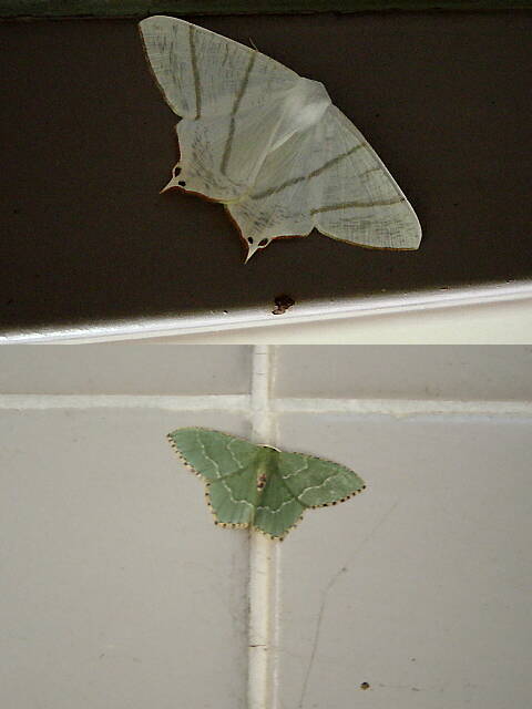 羽化の季節を迎え、大学の建物の中に入り込んでくる蛾が見られるようになった。図鑑によれば、写真上半分はシロツバメエダシャク、下半分はシロオビアオシャク。いずれもシャクが科の仲間。シロツバメエダシャクの食樹は珊瑚樹だという。そう言えば、建物のすぐ横に珊瑚樹がたくさん植えられていた。 |