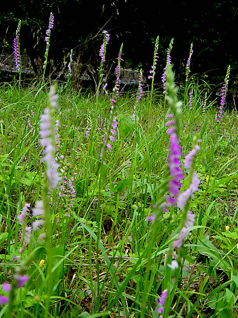 雨上がりの芝地で、ネジバナがいっぱい花を咲かせていた。中には、2本の花穂が寄り添うように咲いている株もあったが、夫婦の世界同様。同じ方向にねじれている株もあれば、正反対の方向にねじれている株もあり興味深い。なお、ネジバナの巻き方については1998年6月4日の日記に引用したことがある。一部を再掲すると