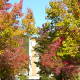 岡大時計台前のアメリカフウの紅葉。10月28日朝の最低気温は岡山市で7.3度、県北の千屋ではマイナス0.3度まで下がった。度重なる台風上陸の影響で葉っぱはかなり傷んでいるが、今年もなんとか紅葉の季節を迎えた。 |