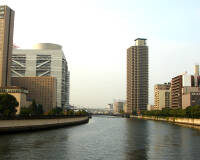 大阪・玉江橋付近から見た堂島川下流方向と「グランキューブ大阪」(大阪国際会議場)。近代的なビルが建ち並ぶいっぽう、福島駅から玉江橋に至るなにわ筋には、昔ながらの魚屋さん、八百屋さん(なぜか合鍵屋兼業)、たこ焼きレストラン、宝石店などが混在していて、いかにも大阪らしい雰囲気をつくっていた。