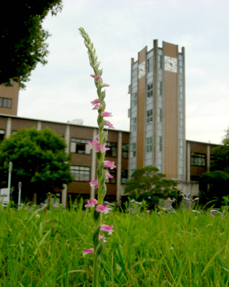 時計台前の芝地で見かけたネジバナ1号。このあたりではかつて、かなりの数のネジバナが見られたが、他の雑草の繁殖などの影響で激減。今年は今のところ2株しか確認できていない。 |