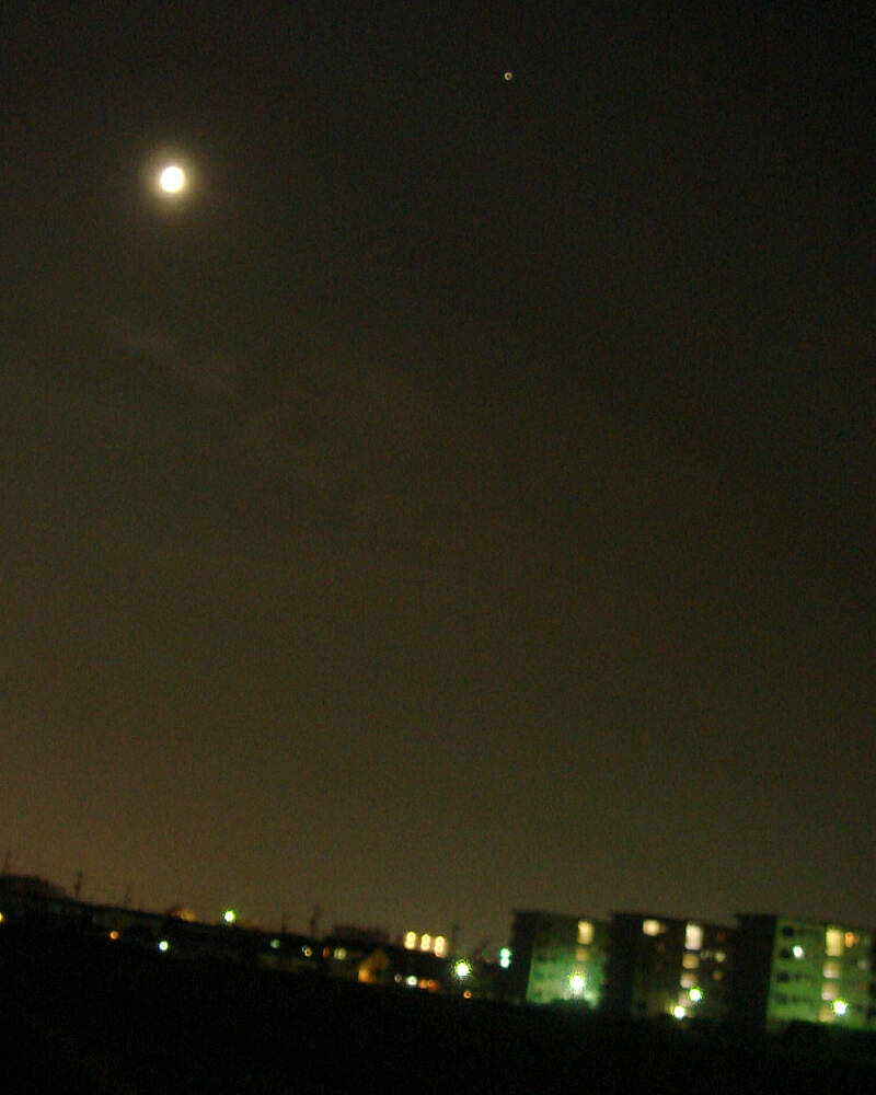月齢12.0の月と木星。先月30日の日記に記したように、6月の満月は一年中で空の最も低いところを通る。7月になるとその時期はズレてきて、今年の場合は月齢12〜13の頃、つまりこの写真に写っている頃が赤緯最南となる。 写真でははっきりしないが、木星の真下には蠍座のアンタレスが見えている。 |
