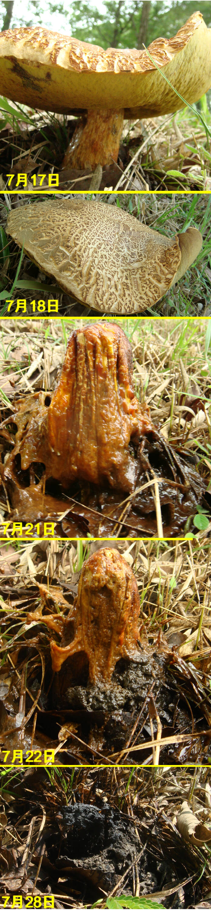 昨日の日記で、キノコ(たぶん)オオシロカラカサタケの3日間の変化の様子を写真で示した。このキノコの場合は、最後は乾いて干しシイタケのようになるが、キノコの中にはドロドロに溶解して「千と千尋の神隠し」に出てくる「オクサレさま」のように変身するものもある。