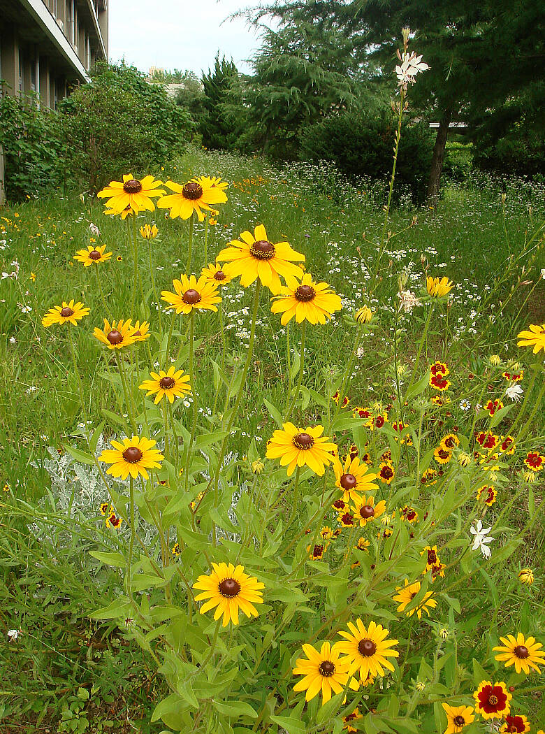 岡山大学構内でお花見(40)ルドベキア 文学部中庭に咲くルドベキア。美しい花であるが繁殖力旺盛で、特定外来生物のリストに挙げられている。写真には他に、ハルシャギク、ハクチョウソウ、また奥の方の白い花はすべてヒメジョオン。(すでに撤去したオオキンケイギク以外の)雑草の花の最強軍団の揃い踏みといった感じ。 |