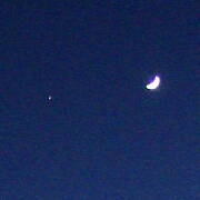 12月21日夕刻の月と木星。天文年鑑によれば、22日の0時2分に4°11′まで接近。 |