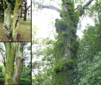 梅雨らしい湿気の多い天気が続いている中で、大学構内の樹皮に生息する苔類、シダ類の緑が目立つようになってきた。写真左上は本部棟前、他は座主川沿い。 |
