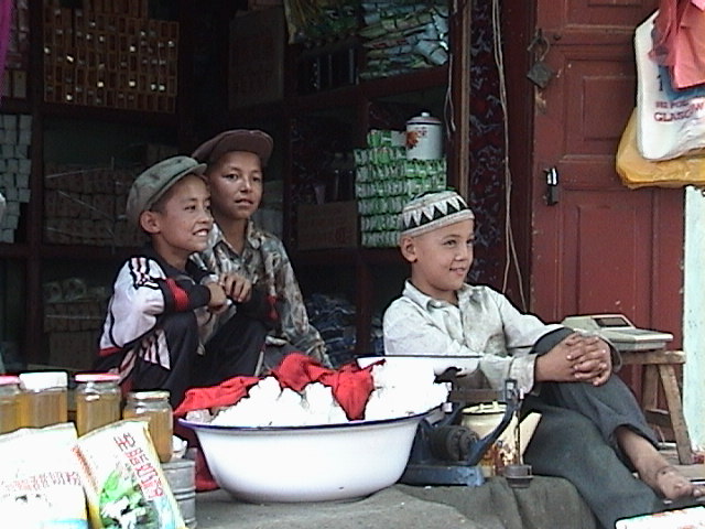 - 香妃墓の敷地内で髪飾りを1個1元で売っていた子どもたち。
