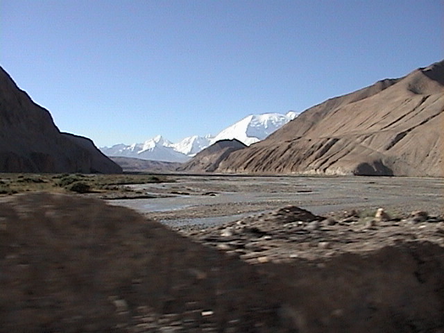 - 半砂漠地帯の向こうに雪山が連なる。黒っぽく見える地帯は植林したところ。