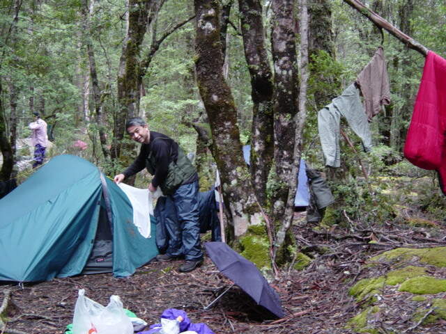 - テントの様子。久しぶりに晴れたので、濡れたものを何でも干す。