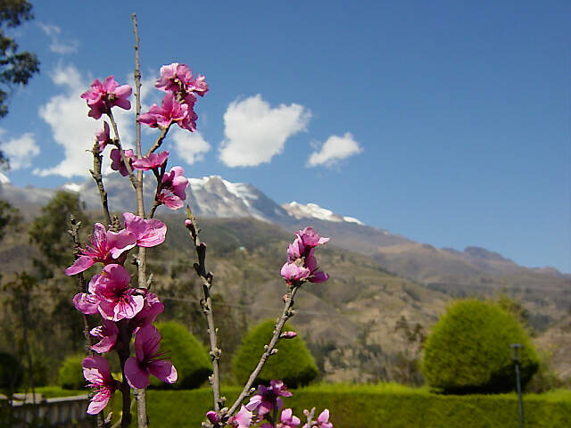 - 【8月15〜16日】この町の面白いところは、桃(写真左上)、秋桜やアガパンサス(写真右下)、ブーゲンビリア、エニシダの一種などの花がいっせいに咲き乱れていること。いったいどういう季節なのかと戸惑ってしまった。このほか、木の枝に着生植物がある(写真右上)ので湿気が多いのかと思えば、すぐ近くにはサボテンの群落がある(写真左下)。