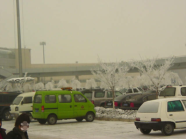 - 天山上空は晴れていたものの、ウルムチ一帯は雪雲に包まれている。降り立ったウルムチ空港は霧の中。
