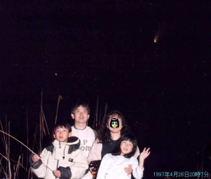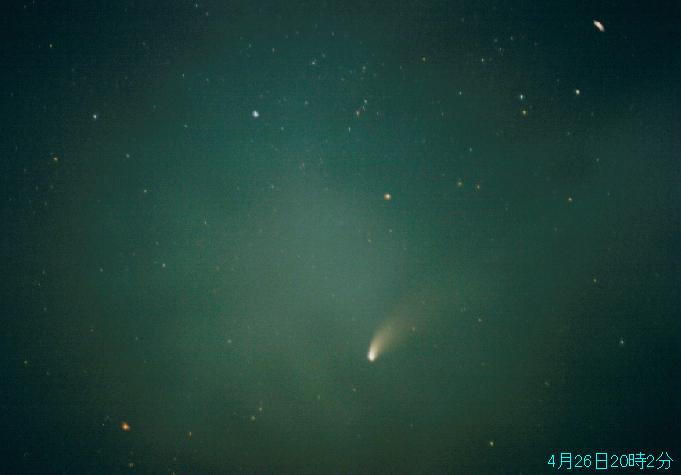 1700頃、同僚の夫婦と家族全員で、レスパール藤ヶ鳴に行く。帰りがけに、空港の北を回って、龍王塚古墳前の空き地へ。比較的透明度もよく、カペラと同じぐらいの明るさで輝いているのが見えた。双眼鏡で眺めると、視野いっぱいに尾が見える。尾の長さは3月末頃に比べると短くなっているが、太くなった分だけ、かえって見やすくなったように思う。あの明るさが急に衰えるとは思えない。5月中旬の見納めの時は、明るさを失う時ではなくて、高度が低くなって春霞の中に消えていく時なのだろう。 私自身は、まだ何度か、ここに来る予定であるが、子供たちには“もう連れてこないぞ。これで見納めだ”と言っておいた。見納めの記念写真を何枚か撮って、彗星に別れを告げた。