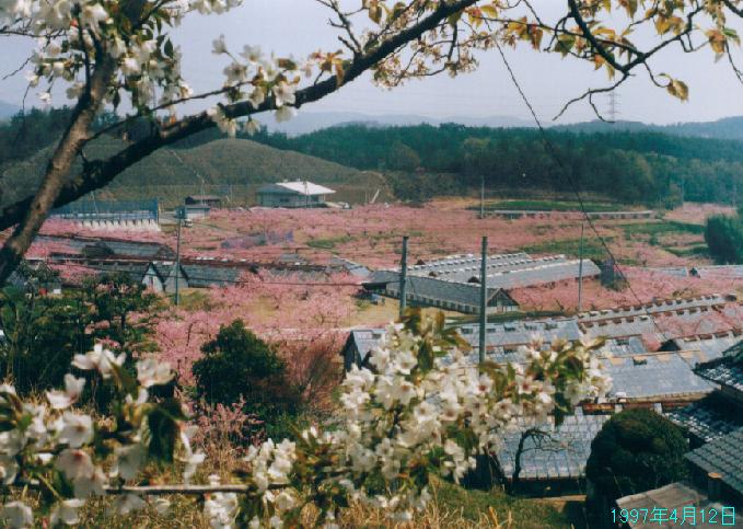 - ここは、岡山市近郊、岡山空港近くの里で撮影したものです。岡山は桃の産地として全国的に有名ですが、このあたりは特に桃畑やマスカットの温室などが点在し、4月上旬には美しい花が見られます。また、近くには、岡山白桃発祥の地の石碑などもあります。