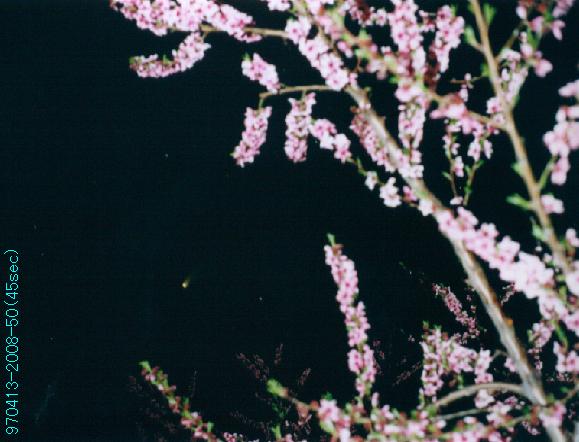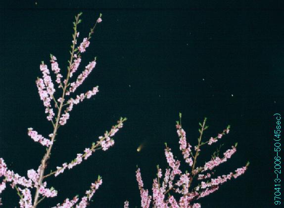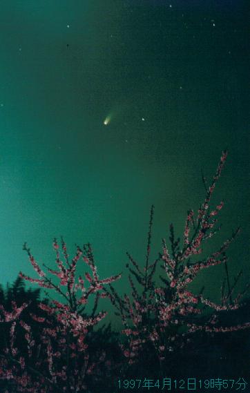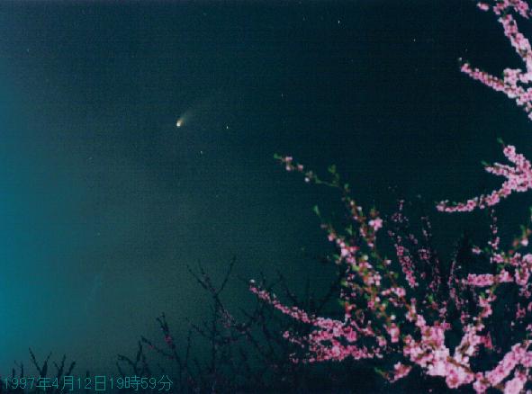 桃の花を前景にしたヘールボップ彗星の写真(1997年4月13日撮影)
