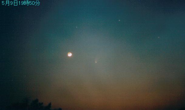 2月19日以来、素人・初心者ながら、固定撮影方式で写真を撮り続けてきましたが、これが、この彗星の最後の写真となります。露光時間を彗星のほうに合わせてあるので、左横の三日月が満月のように写ってしまいました。地球照の影響もあるようです。