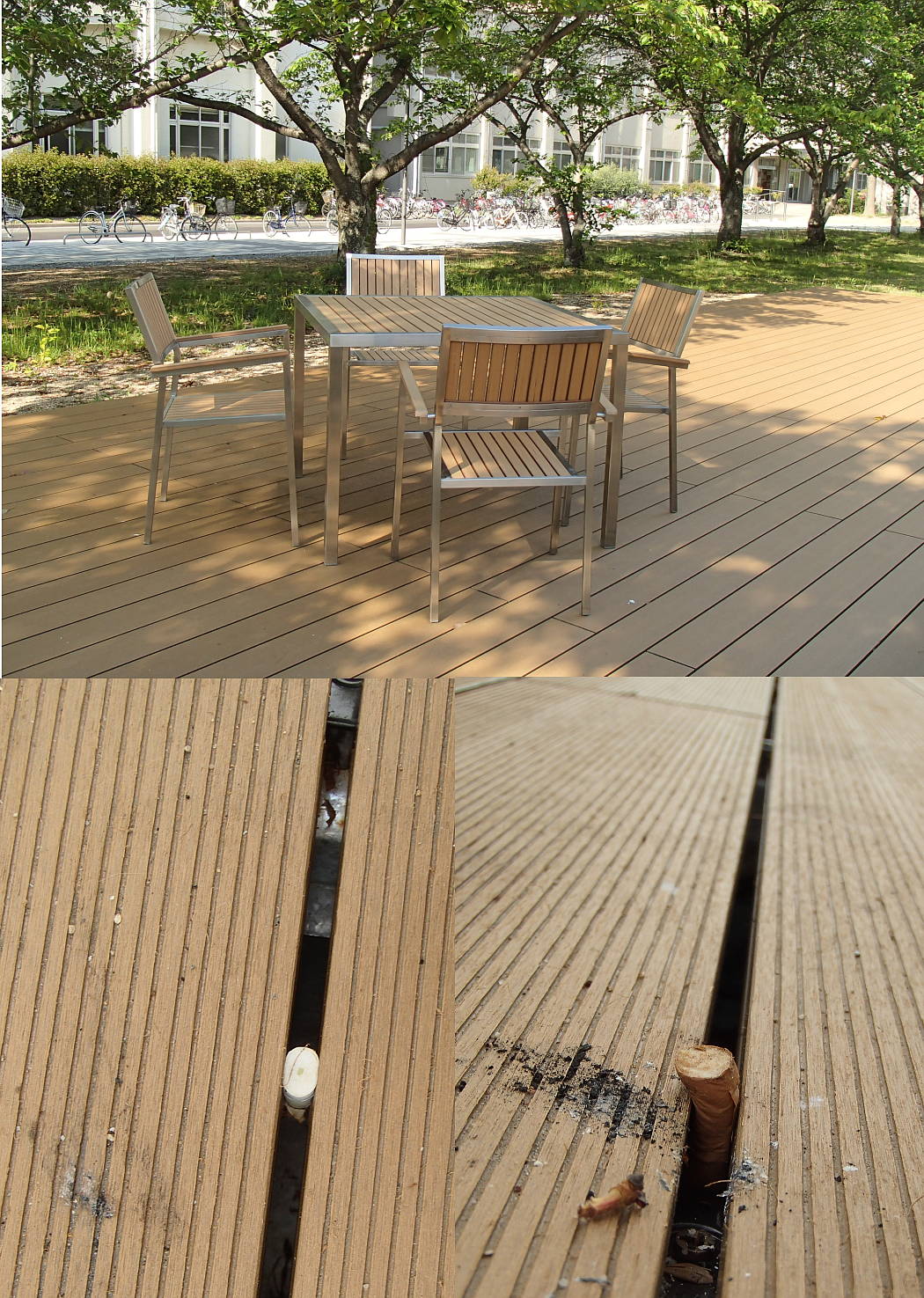 午後、中庭のテーブルを囲んで男子学生3名がくつろいでいたが、うち1名が加えていたタバコを靴の裏にこすりつけて消しているところを目撃したので、ここは喫煙指定場所でない、吸い殻はボヤの原因になるので危険、来年からは全面禁煙になることを告げた。吸い殻はポイ捨てせず持ち帰るように指示したが、3時間後に見に行ったところ、床板の隙間に吸い殻2本が差し込んだままになっているのを確認。但し、その当該者がポイ捨てした吸い殻であるかどうかは確認できていない。