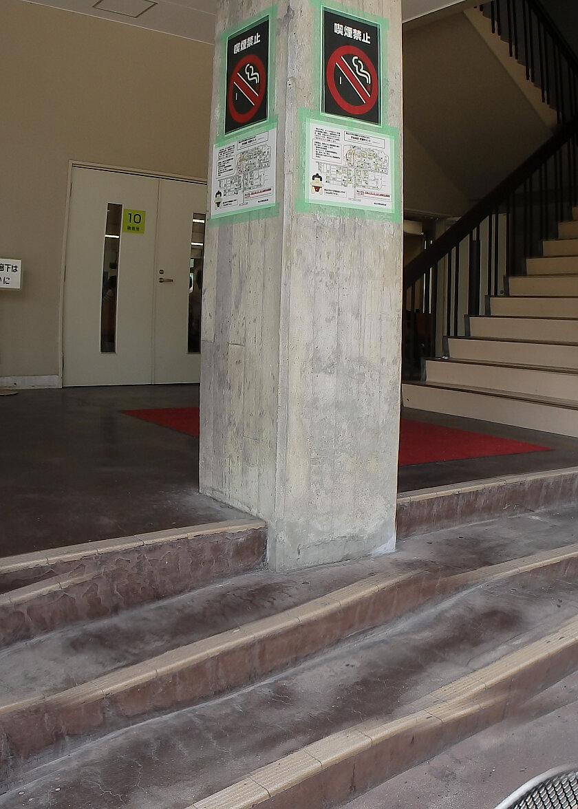 ↓の件があったので、事務方に要望を出しておいたところ、さっそく、文法経講義棟東側出入り口の柱に写真にあるような、禁煙指示と指定喫煙場所案内のポスターを貼っていただくことができた。その後、昼休みと、4限開始前には、当該場所では喫煙行為は見当たらず、まことに喜ばしい日中となった。【パノラマ撮影モードのため、階段部分がゆがんで二重に写っている】。