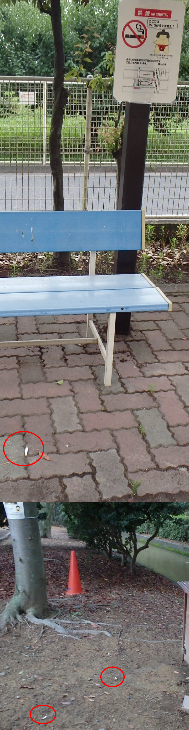 早朝の散歩時、農学部農場販売所前のベンチで1本、座主川沿いのレトロな門の東側の空き地で、新たに2本の吸い殻がポイ捨てされているのを発見。これらの定点観測場所では、少なくとも1名の常習者が、同じ時間、同じ場所に来て喫煙し、わざわざその証拠を残すかのように、1本ずつ吸い殻をポイ捨てしていることが分かる。
