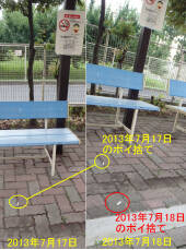 早朝の散歩時、6月27日に教育学部の学生に注意したベンチの下に吸い殻がポイ捨てされているのを発見。7月1日午後〜7月2日朝までのあいだにポイ捨てされたものを推測される。