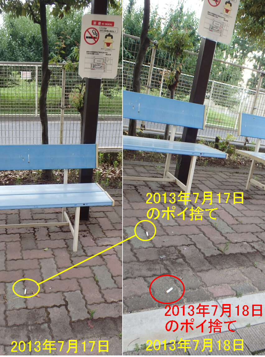 早朝の散歩時、農学部販売所・自販機前のベンチの足元に3本の吸い殻がポイ捨てされているのを確認した。この場所は前日朝には2本のポイ捨てがあり(7月6日朝の記事参照)、7月6日午後から7日朝までのあいだに、同一人物がさらに一本のポイ捨てをしたものと推測される。土日は職員による清掃活動が行われないので、前日までの吸い殻がそのまま残り、ポイ捨て常習者の行動特徴を観察するには絶好の機会である。