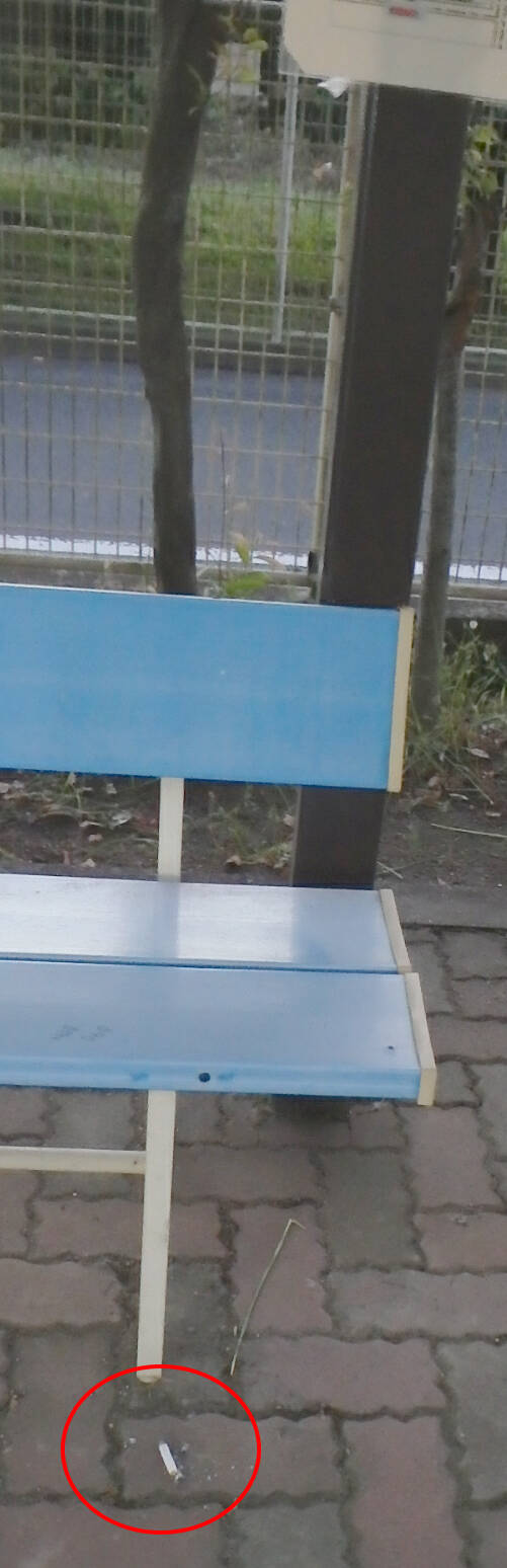 早朝座主川沿いの遊歩道を散歩したところ、ベンチの足元に新たに2本の吸い殻と、近くにコンビニのレジ袋が散乱しているのを発見。日曜日早朝に通った時にはそのようなものは無かったので、日曜午後〜月曜朝までの間に新たにポイ捨てされたものと推測される。