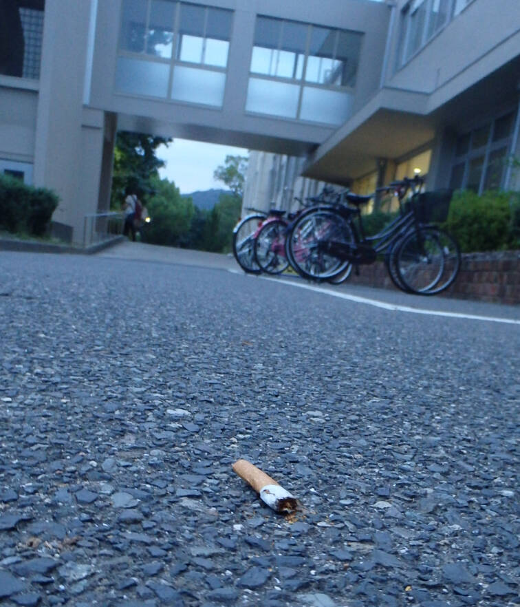 昼までのあいだに見かけた喫煙はこの1件だけであったが、文法経1号館前や文化科学総合研究科棟前には、相変わらず、前日夕方から朝までにポイ捨てされたと推測される吸い殻が散乱していた。