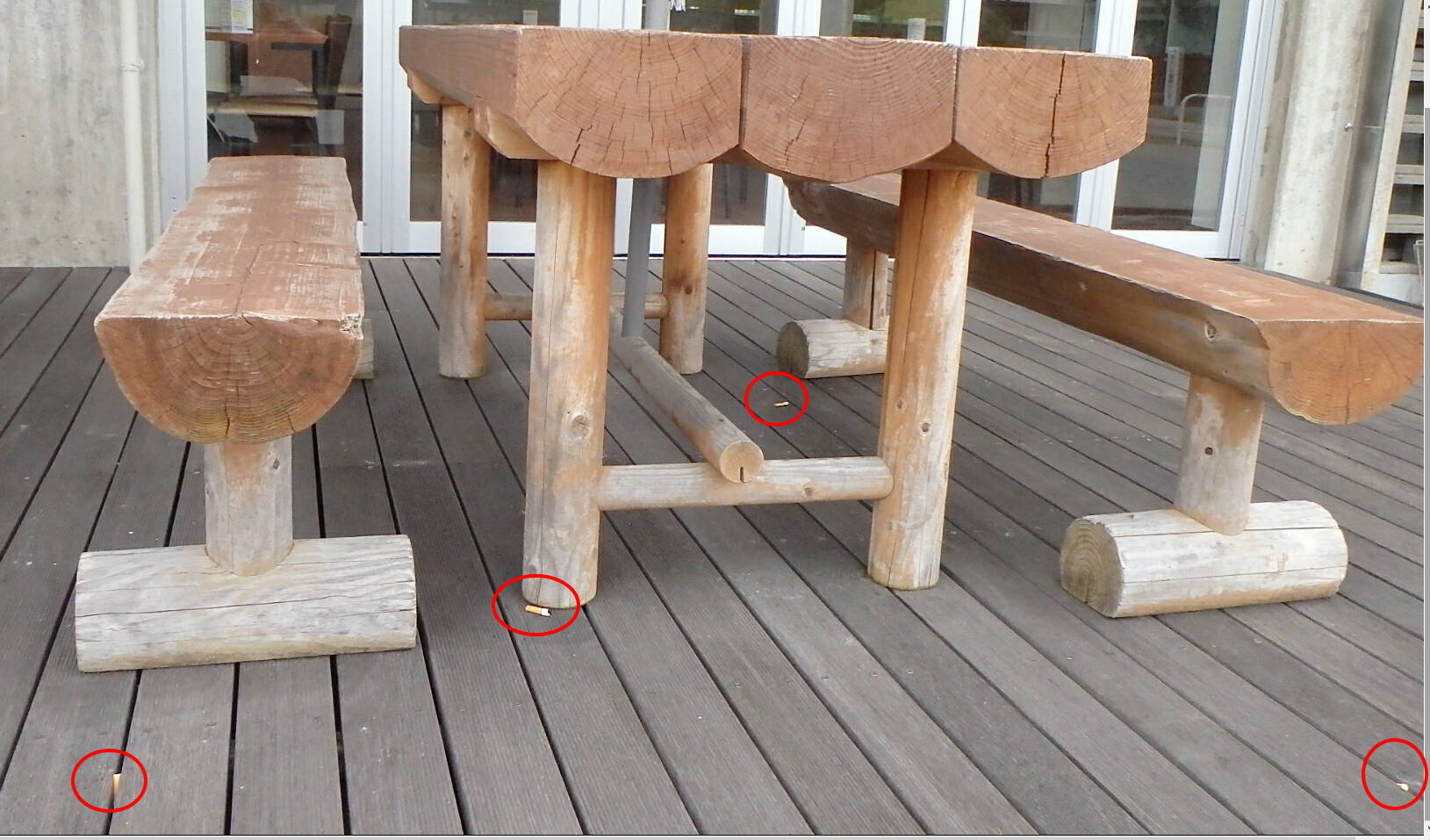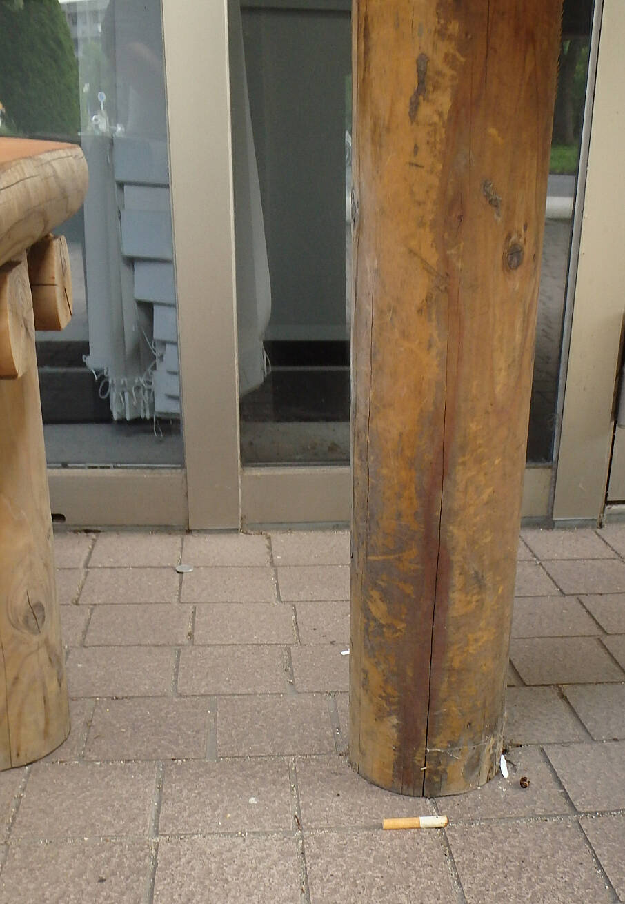 いっぽう、一般教育棟構内・大学会館南のオープンカフェのテーブル下には吸い殻1本がポイ捨てされており、また、南西側のベンチでは、ベンチの隙間に埋め込まれたものを含めて合計12本がポイ捨てされていた。これらの行為者はいずれも人間失格者として認定させていただく。