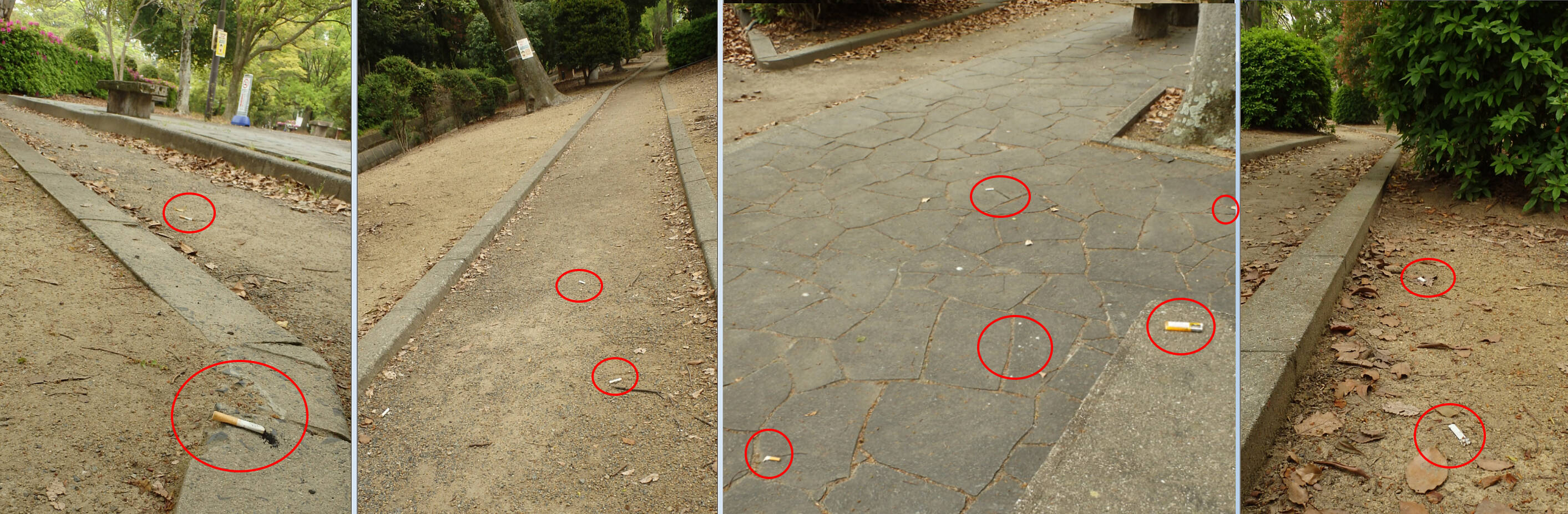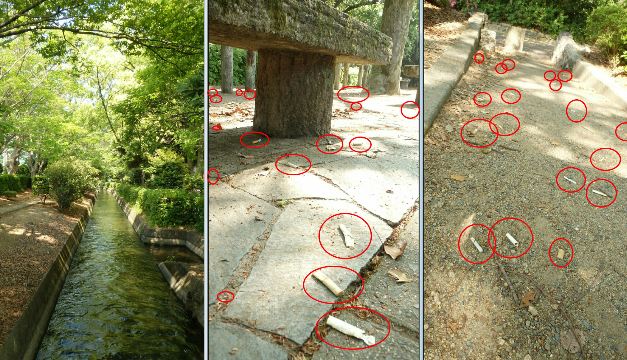 朝、座主川沿い遊歩道を通過したところ、理学部南のベンチ付近で比較的新しい吸い殻10本以上がポイ捨てされていた。昨日夕刻から本日朝までのあいだに集団喫煙が行われたものと推測される。