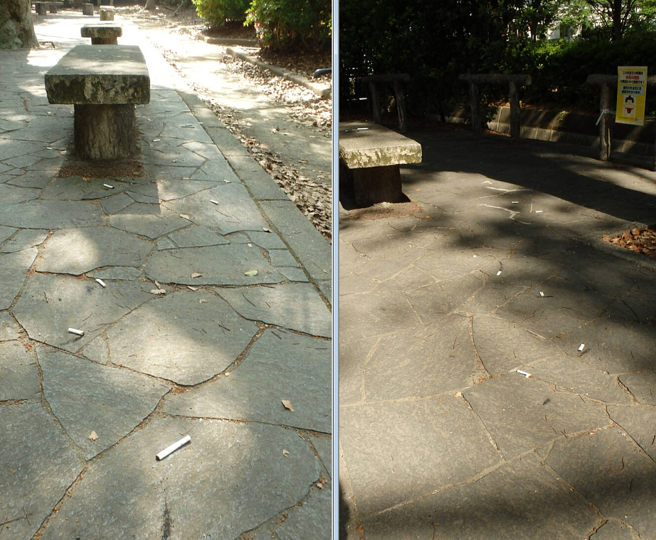 日中、文学部中庭で環境整備作業をしていたところ、テラスの敷板の間に比較的新しい吸い殻がポイ捨てされているのが見えた。昨日午後以降のポイ捨てと推測される。