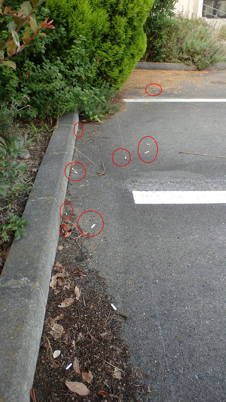 昨日の夕刻、文学部西の駐車場隅で喫煙している人がいるという通報があったが、私が確認に行った時は姿が無かった。土曜日の昼に同じ場所に行ってみると、確かに吸い殻が10本ほど落ちており、隠れ喫煙が常習的に行われていることが分かった。「隠れ喫煙」ではあるが、ここで喫煙していますよと言わんばかりに吸い殻をポイ捨てしているところが、傍若無人に振る舞う悪質喫煙者の特徴である。