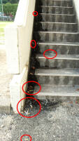 朝、文法経講義棟周辺を巡回したところ、清掃作業により一部は除去されていたものの、26番教室外側階段【写真】、西側自販機前などに新しい吸い殻がポイ捨てされており、合計本数は11本になっていた。