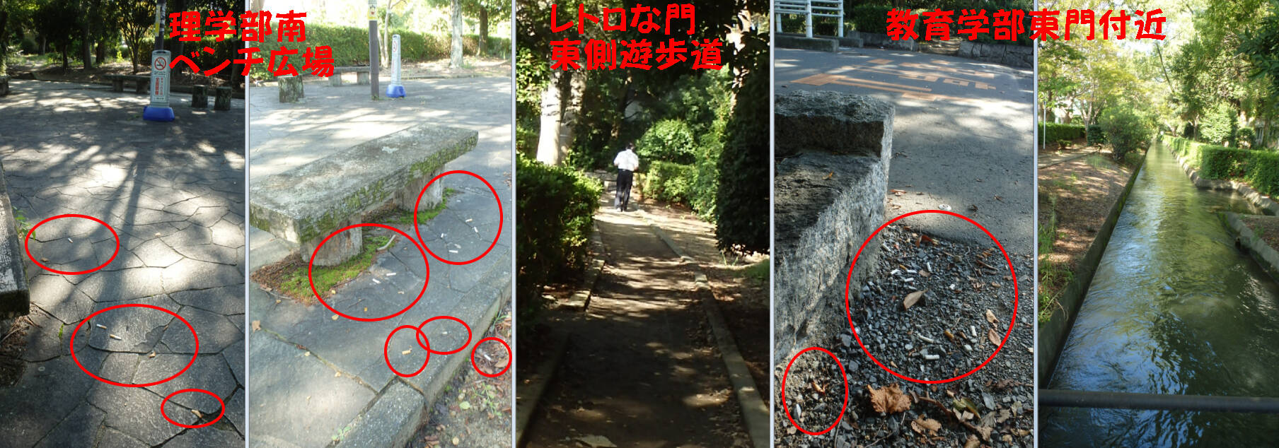このほか、岡大西門東側ベンチ広場に比較的新しい吸い殻10本以上がポイ捨てされていた。