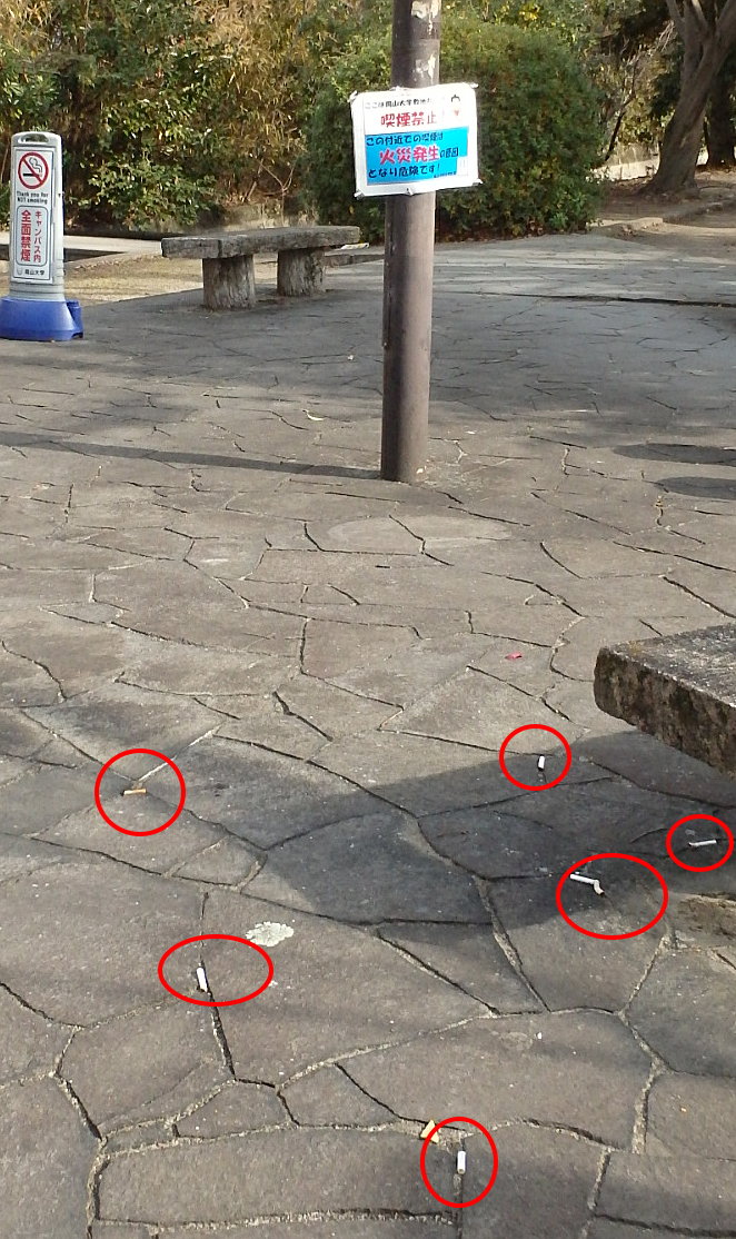 このほか、理学部南のベンチ広場【写真】で、100本を超える大量のポイ捨て吸い殻が確認された。目の前には全面禁煙の看板があり、通行人が多い場所で、いつこのような危険喫煙を続けられているのか謎である。ちなみに、この場所は、岡大西門付近を通過する時には何度も目を向けているが、最近では、私が通行する時間帯に喫煙をしている者は全く見かけない。
