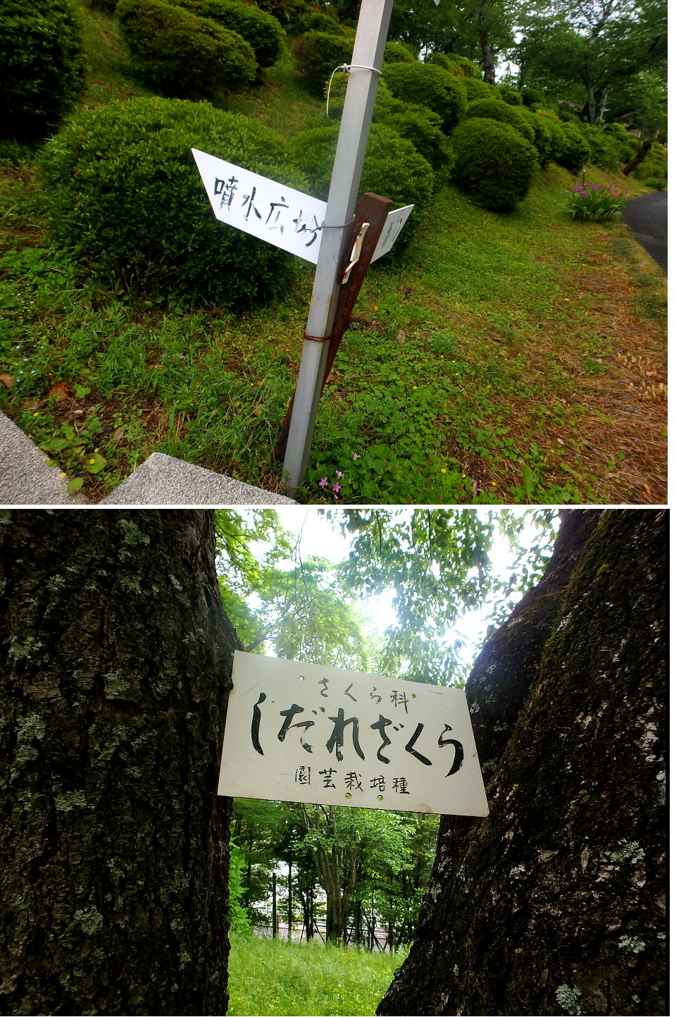 5月10日の日記に、半田山植物園内最古と思われる樹名板の写真を掲載した【右に再掲】。 今回の写真は、園内で2番目に古いかもしれない「しだれざくら」の樹名板と「噴水広場」の案内柱。 「しだれざくら」は古墳裏(岡山理科大の近く)のシダレザクラの大木にかけられている。 「噴水広場」はエントランス正面の石段を登ったところにあるが、その方向に向かっても噴水はどこにもない。なお、この案内柱には右に進むと「サニーガーテン」となっているが、サニーガーデンとは温室のことで公式マップにも記載されている。 |