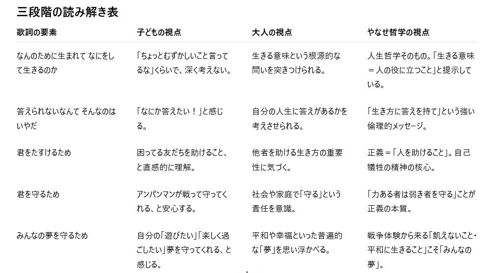 子どもの視点 / 大人の視点 / やなせ哲学の視点 で三段階に読み解いた表を作ってもらった。