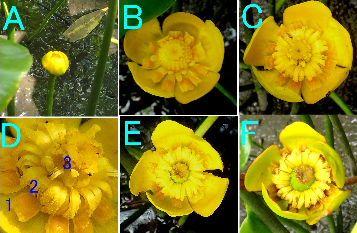 9月下旬、半田山植物園でサイコクヒメコウホネの花が次々と咲いていた。写真を撮っているうちに、上掲の写真B~CのタイプとD~Eのタイプの2種類があることに気づいた。写真Bの段階では、老眼の私には雄しべが先に出て柱頭盤(雌しべ)を覆い隠しているように見えたが、撮影後に拡大したところ中心部にちゃんと柱頭盤が顔を出していることが確認できた。