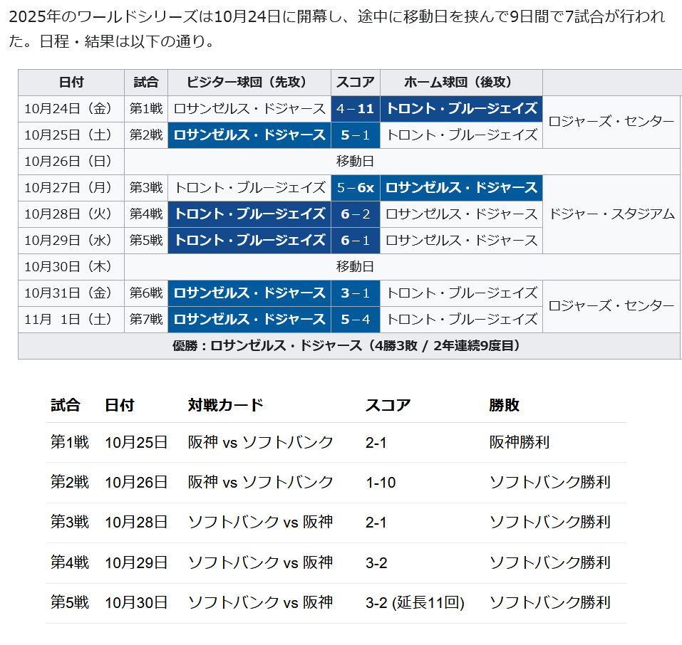 2025年のワールドシリーズは大谷選手や山本選手の活躍もあり、ふだん野球中継を視ない私も、昼食時などにチャンネルを合わせたことがあった。また最終戦の11月1日(土)の昼は孫たちと一緒に昼食をとるため順番待ちをしていたが、周囲で女性たちが試合経過を話題にしており、幅広い層に注目されていることが感じられた。 さて、ワールドシリーズが終わったのでそろそろ日本シリーズの始まりかと思っていたが、連休が過ぎてもちっともNHKニュースのスポーツコーナーで取り上げられることがない。もしやと思って「日本シリーズ 結果 2025」で検索したところ、10月25日から始まり10月30日にソフトバンクの4勝1敗で全日程を終了していたことが分かった。 今季は10月20日から28日までオーストラリア南西部を旅行していたので、日程の前半は旅行と重なっていて観戦できなかったが、第3戦から第5戦はその気になれば観ることができたはずだった。 ネットで検索したところ、今年の中継は、 2025年の日本シリーズは、以下の日程で地上波テレビ局が中継します。となっていたが、私は17時頃からの夕食の時間帯にはテレビを視ているものの、18時以降には視る習慣が無いため、気づかなかったものと思われる。NHKニュースのスポーツコーナーでもワールドシリーズの話題ばかりに集中していたように思う。 |