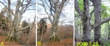 11月15日(土)、久しぶりに県北の森林公園を訪れた。写真は2本が抱擁しているように見えるブナ。 この2本は2006年5月22日の日記でも取り上げており、19年半ぶりとなる。豪雪にも耐えて成長を続けているのが羨ましい。 当時の日記では『夫婦ブナ』と呼んでいたが、森林公園内には他にも『夫婦』と呼ばれるようなブナがあることから、それらと区別するために今回から『ぬくもりブナ』と呼ぶことにしたい。 |