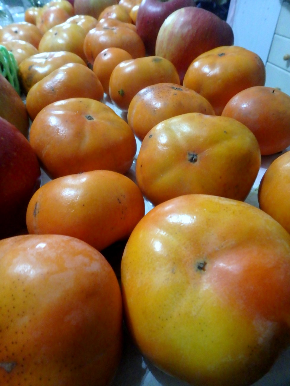 柿の果肉は水分量が比較的少なく(約80%前後)。リンゴやモモ(約85〜90%)などより乾き気味。また、表面の皮が厚く、ロウ質の層(クチクラ)に覆われているため、水分の蒸発が少ない、微生物が侵入しにくい、という特徴がある。