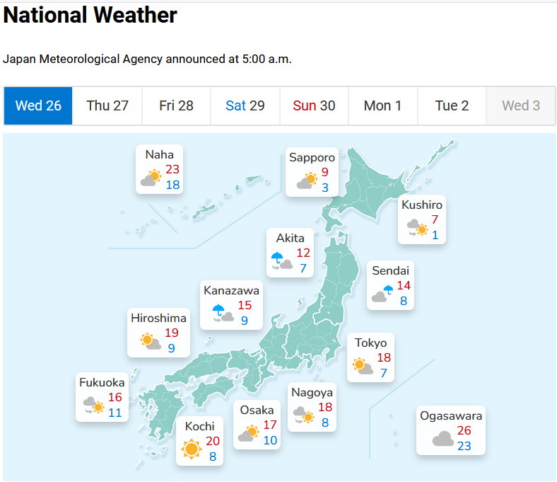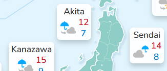 NHK World Japanで配信されている気象情報の一例。雨を表すマークは国内向けと同様「傘マーク」になっていた。↓の記事参照。 |