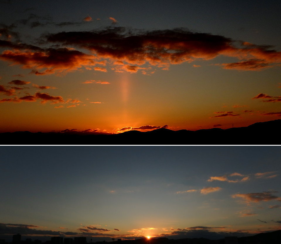 12月4日の日の出(写真上段、撮影時刻は07時02分)と日の入り(写真下段、撮影時刻は16時42分)。暦上の日の出は06時55分、日の入りは16時53分であるが、いずれも低い山があるため、日の出は暦より7分遅く、日の入りは11分早くなっている。 ↓の記事参照。 |