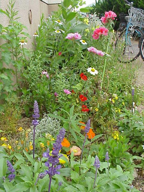 2枚目は、私がいま住んでいるアパート下の花壇。ゴデティア、ファリナセア、ナスタチューム、アイスランドポピーなどが咲いている。こちらも国有地だが、環境整備作業の名目で、同じようにポット苗を植えている。毎月、アパート住人による草取り作業をやっているおかげで、雑草はあまり生えない。