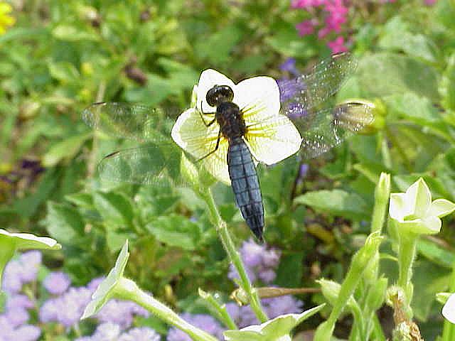 ハナタバコに珍しいトンボが止まっていた。ずいぶん胴体が太いと思って図鑑で調べたらハラビロトンボ(腹広トンボ?)というそれらしき名前がついていた。 |