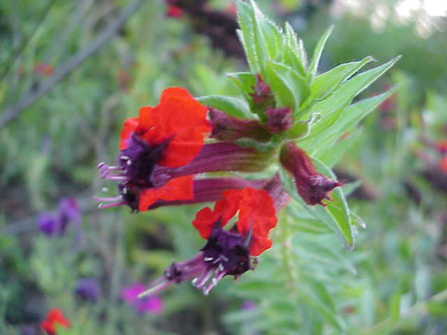 今年の春に花屋の処分品で買ったポットから珍しい花が咲き始めた。種名はクフェア・レッドマウスという。「レッドマウス」はたぶん園芸用の愛称ではないかと思われるが、よく見ると、顔が真っ黒で胴体の赤いネズミのようにも見える。というか、赤い羽根を広げたコウモリのようだ。 |